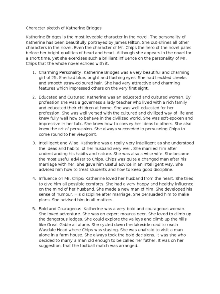 Chips as an institution of Brookfield. Get an answer for Draw a character sketch on Katherine Bridges and find homework help for other Good-bye Mr. What influence did Katherine Bridges exercise on Mr.